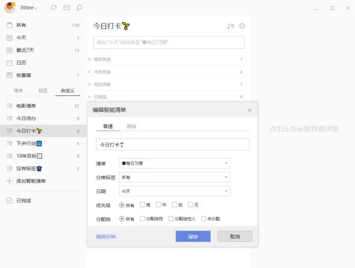 为什么要隐藏打卡清单内,这里也要说明下,因为本人每日打卡的任务较多,如果全部放在今日视图会造成任务过多的直观印象,大脑会产生抵触心理,而且打卡类任务本身只要去完成,所以我选择了隐藏并且用智能清单筛选。 这样可以减轻心理负担。