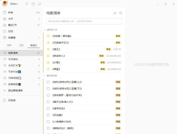 #重读以在追进度这个 * 清单夹为子,里面分为四个清单,本质其实是三种:电影、电视剧、书单。电影的清单就很简单的分类为:待看和影院上映两个,标签也很简单,一个是高清一个是影院。