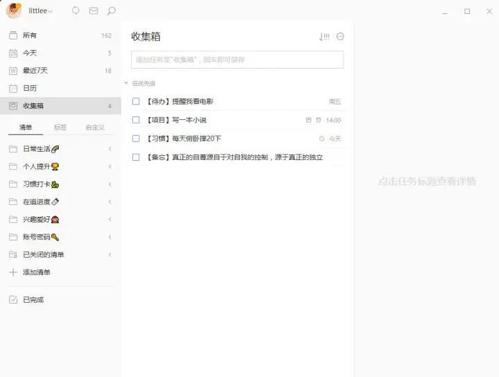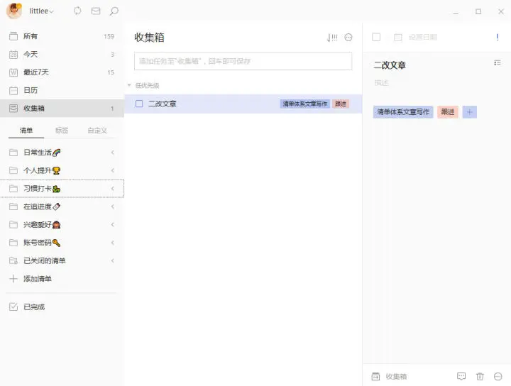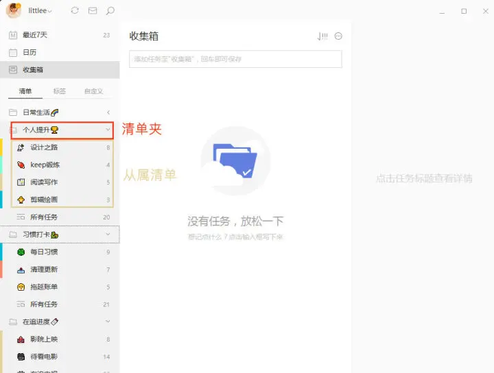 在这里还要引入一个清单的迁越概念,其实也是一个升级的概念:当一个任务不够用升级就成了项目,当项目不够用就升级成了清单,当清单不够用就升级成了清单夹。