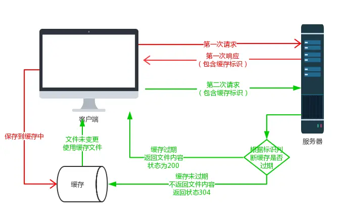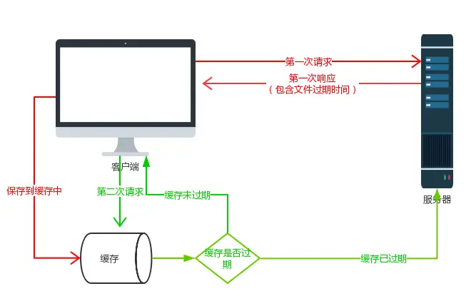 浏览器第一次请求数据时,服务器会将文件的过期时间和文件一起返回给客户端,客户端将二者备份至缓存数据库中。再次请求数据时,客户端将根据文件的过期时间去判断,文件是否过期。文件未过期,则直接使用缓存数据库中文件,文件过期了,则重新从服务器上获取。