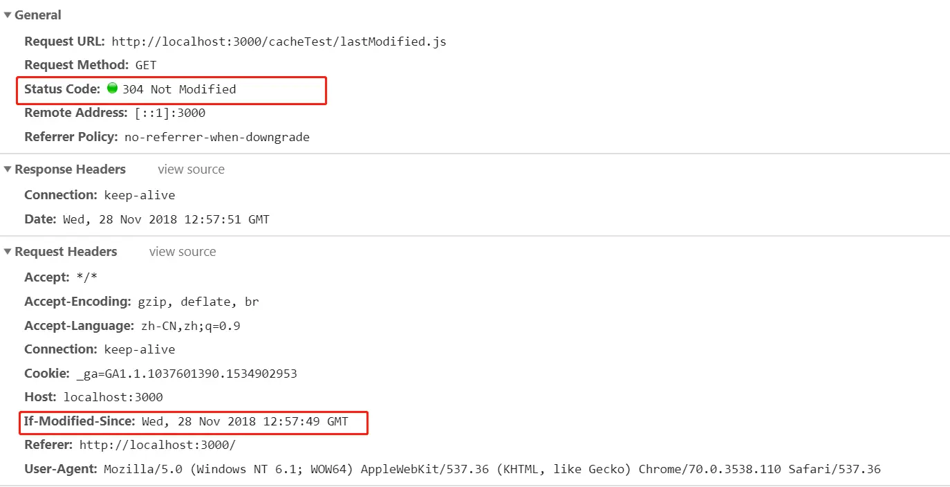 Last-Modified的第二次请求时,请求头包含If-Modified-Since,服务器获取到该缓存标识后,用该标识和文件进行比对。如果缓存文件未过期则返回304状态码,客户端使用缓存问题。如果缓存过期则返回新文件,状态码为200。