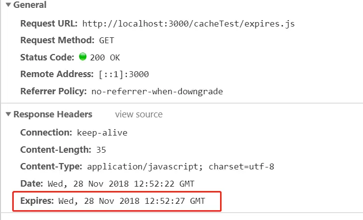 Expires 第一次请求服务器是,响应头会返回一个Expires的文件过期时间。 如下图所示: