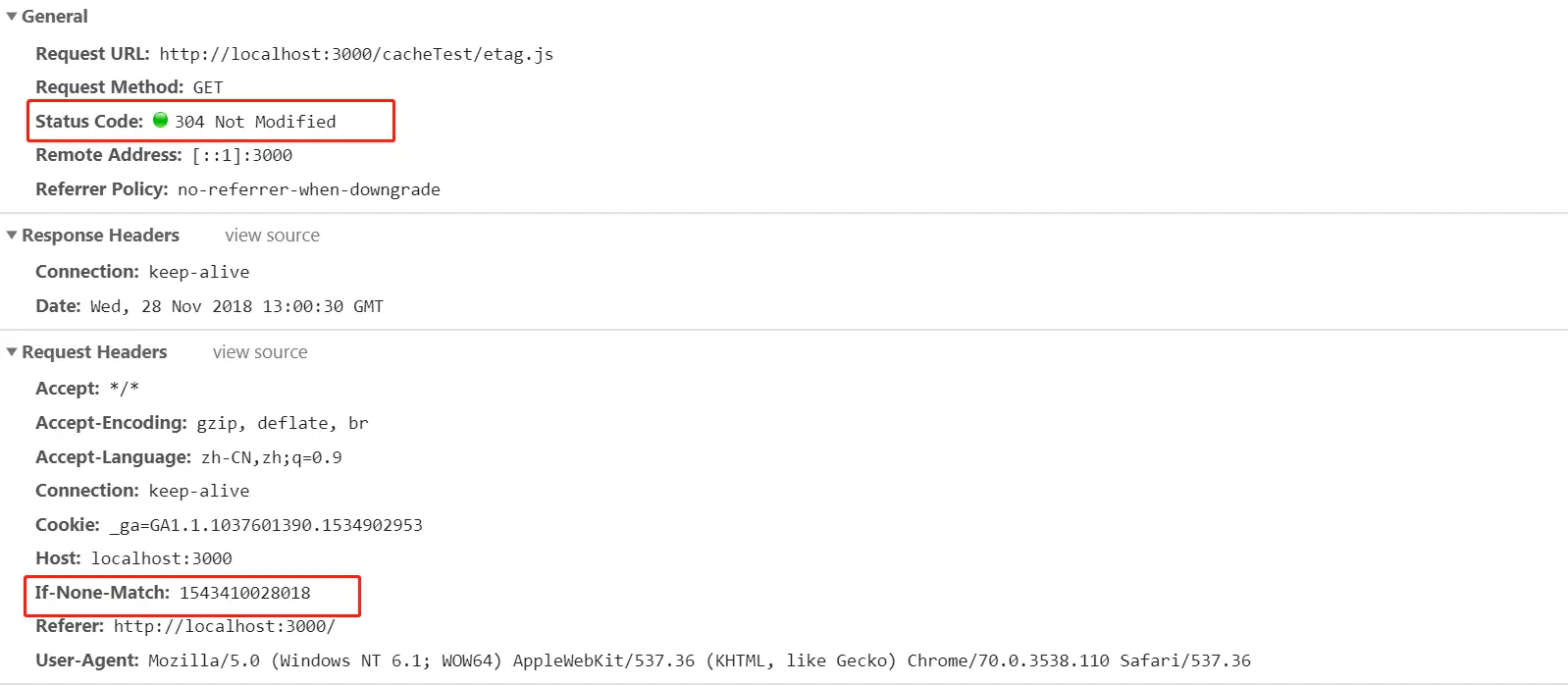 - Cache-Control: no-cache 必须先与代理服务器确认是否更改,然后在在决定使用缓存还是请求,类似于协商缓存(304)