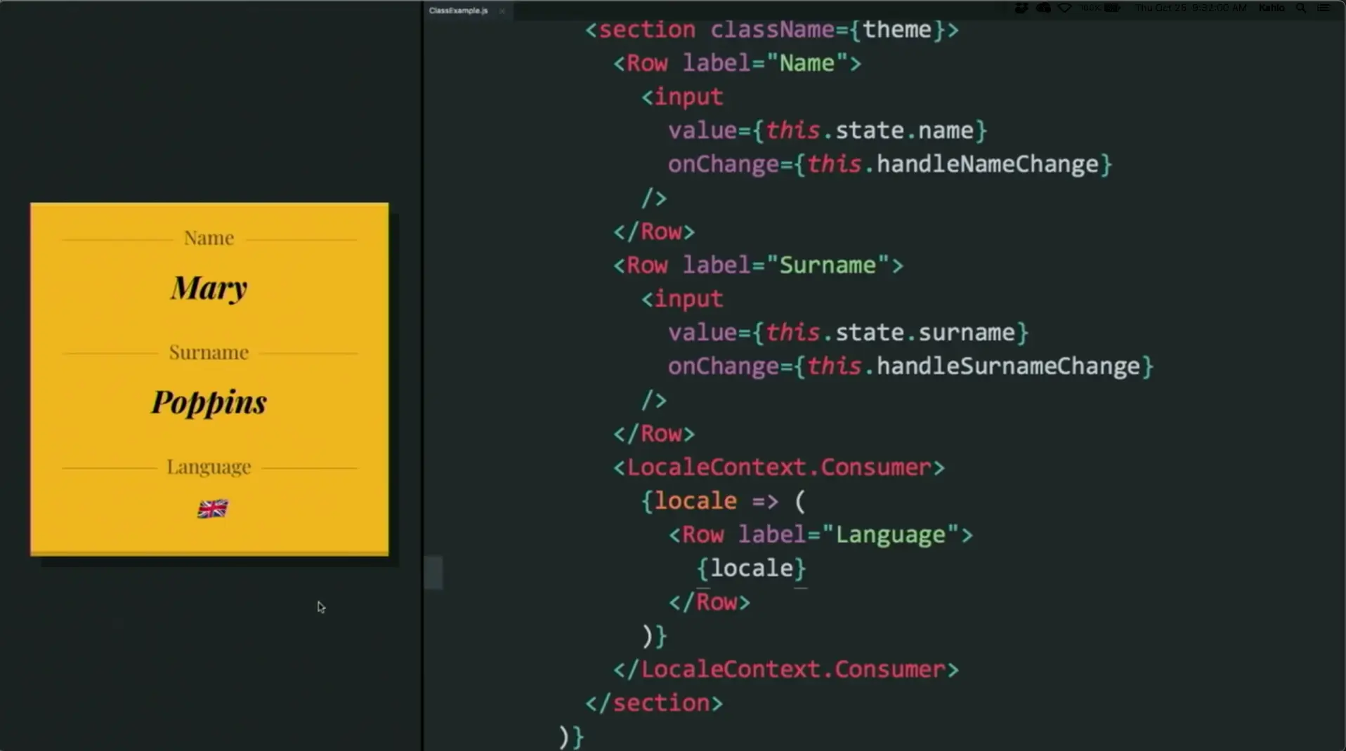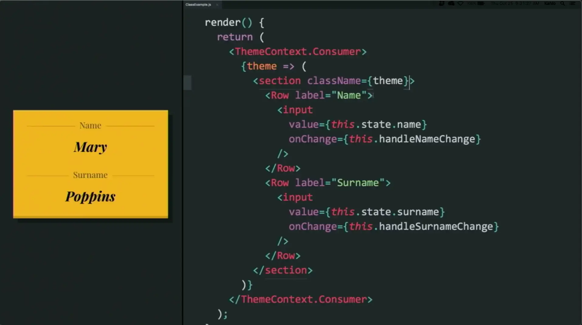 好的,让我们回到我们熟悉的 class 例子。我们接下来想要添加第二个区域。比如,添加一个姓氏的区域。那么我们通常的做法是在 state 添加一个新 key。我把这行复制然后粘贴到这里。这里改成 surname。在这里渲染,这里是 surname 和 handleSurnameChange。我再来复制这个事件处理函数,把这里改成 surname。别忘了绑定这个函数。好的,Mary Poppins 显示出来了,我们可以看到程序运行正常。