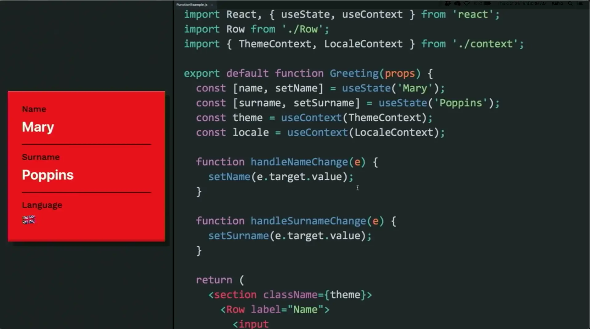 从概念上讲,surname 和name 关系不大。所以我们需要做的是,再次调用 useState hook 来声明第二个 state 变量。在这里我声明 surname,当然我可以给它起任何名字,因为它就是我程序里的一个变量。再来设置 setSurname。调用 useState,传入 state 初始变量 'Poppins'。我再一次复制和粘贴这个 Row 片段。值改为 surname,onchange 事件改为 handleSurnameChange。当用户编辑surname 时,不是 sir name,我们希望能够修改 surname 的值。