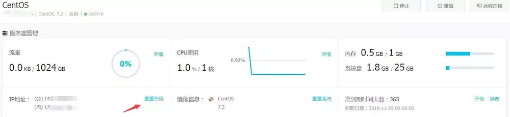 如图所示就可以看到服务器的信息了,包括流量等资源使用,阿里云的VPS没有初始密码的,这里点击“重置密码”就可以自己设置服务器密码,然后用远程工具比如xshell就可以选择进行连接了,记得使用默认的22端口。