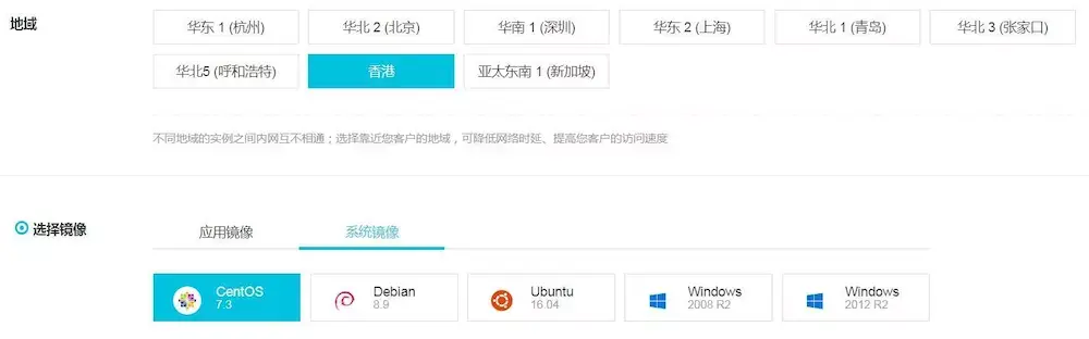 可以看到轻量云服务器配置选项,地域选择香港机房,系统镜像建议选择centos系统,当然选别的也可以:
