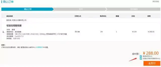 需要勾选同意如图所示两个协议,然后就可以直接支付了。支付之后进入管理控制台,大概三四分钟后就配置好服务器了: