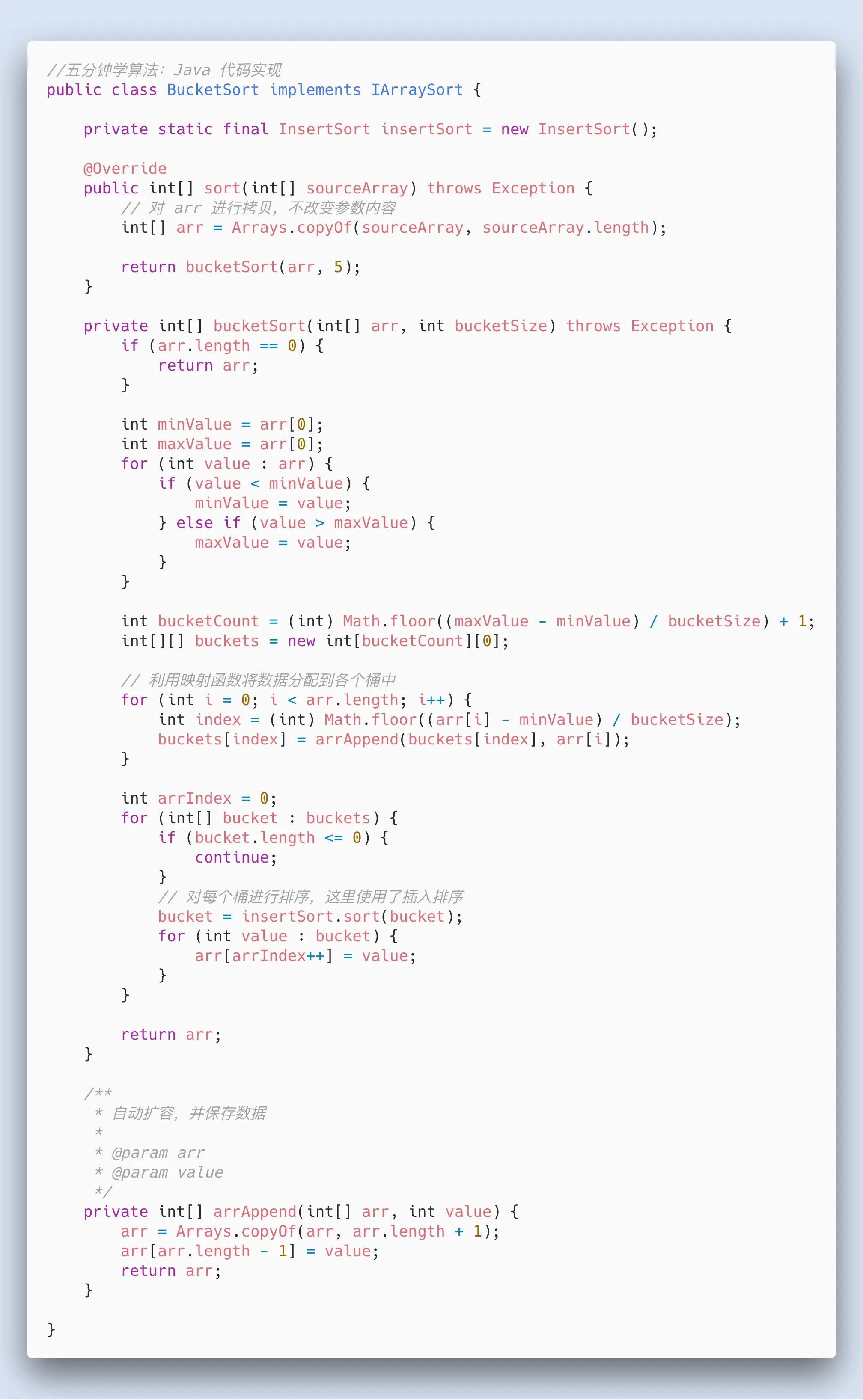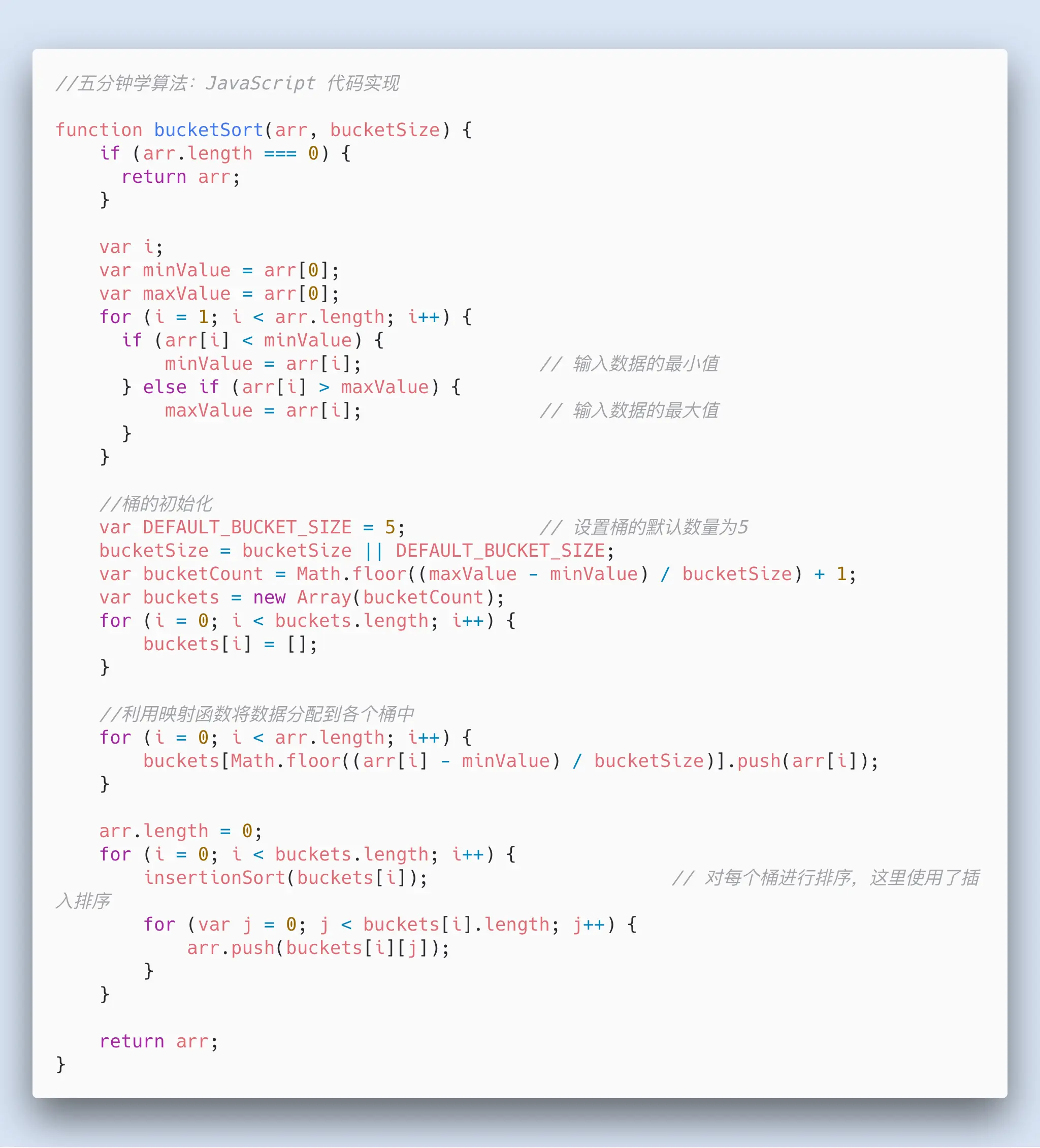 当向同一个索引的桶,第二次插入数据时,判断桶中已存在的数字与新插入数字的大小,按照左到右,从小到大的顺序插入(可以使用前面讲解的插入排序)实现