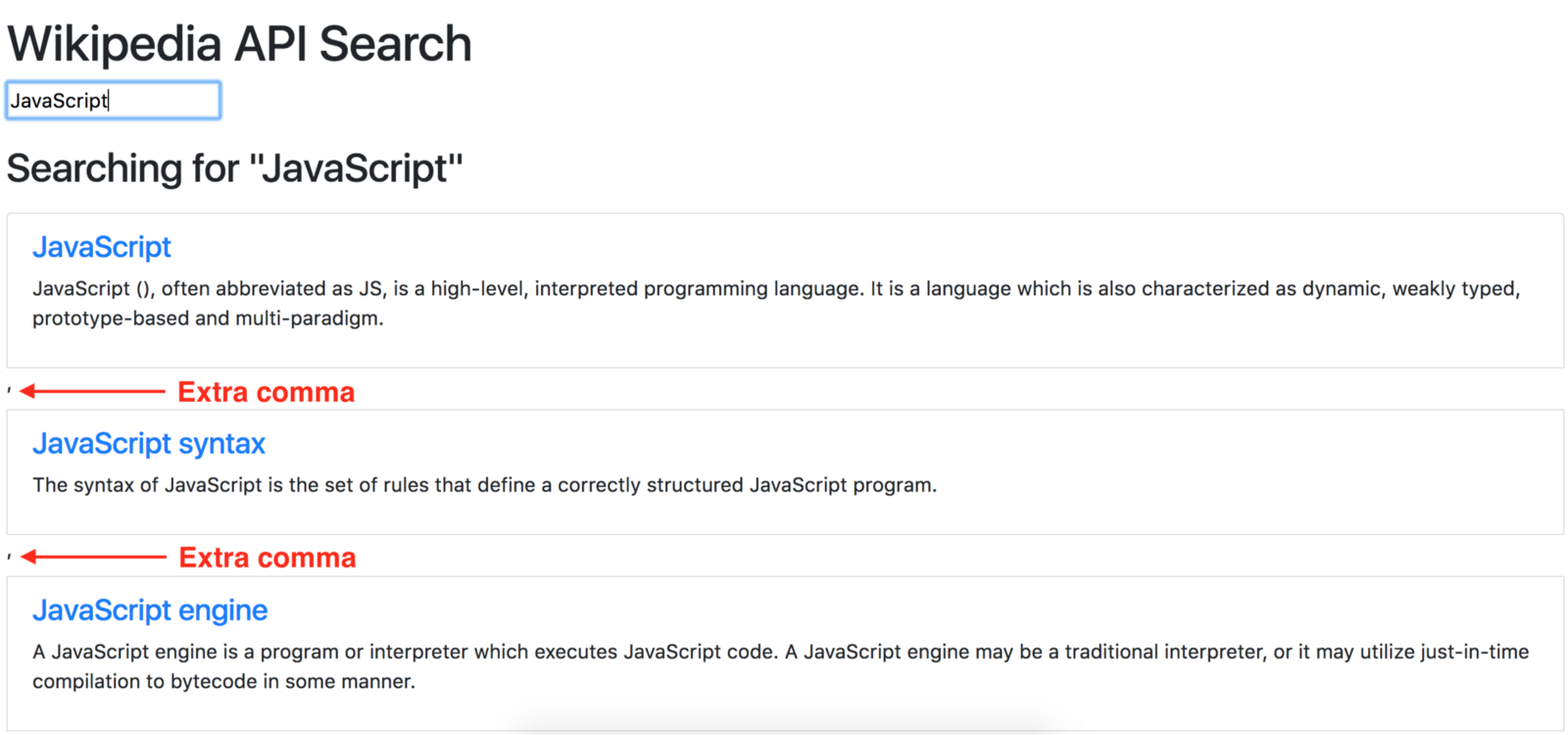 export default ([query, names, summaries, links]) => ` <h2>Searching for "${query}"</h2> <ul class="list-group"> ${names .map( (name, index) => ` <li class="list-group-item"> <a href=${links[index]} target="_blank"> <h4>${name}</h4> </a> <p>${summaries[index]}</p> </li> ` ) .join('')} </ul>`;Now your UI’s much cleaner.