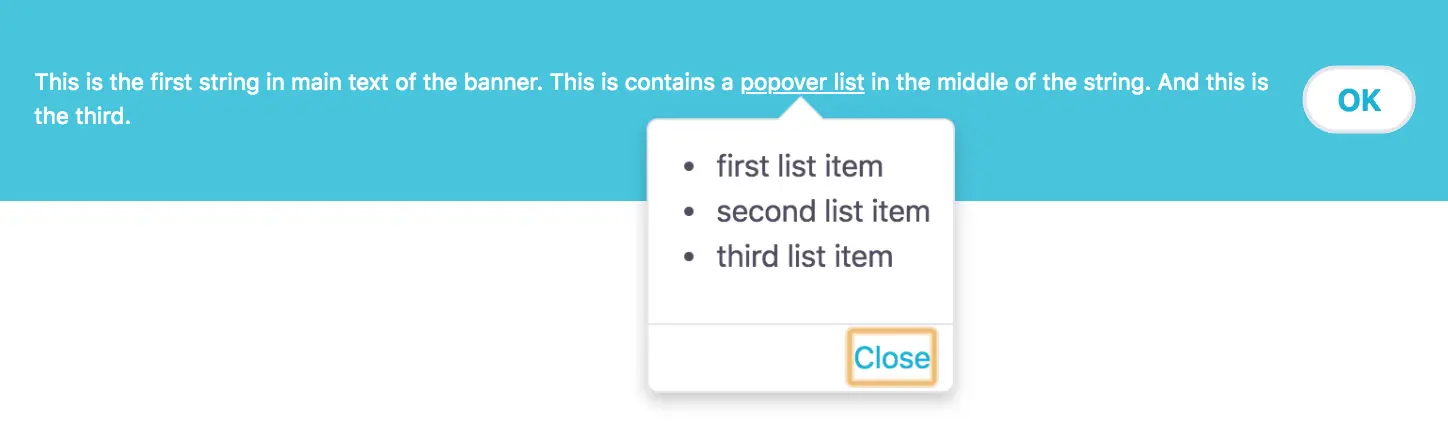 We have two, a stateful component and a function component. Overall these create a banner than has some text and a button. The text on the banner can be clicked to open a popover, containing a bullet pointed list.