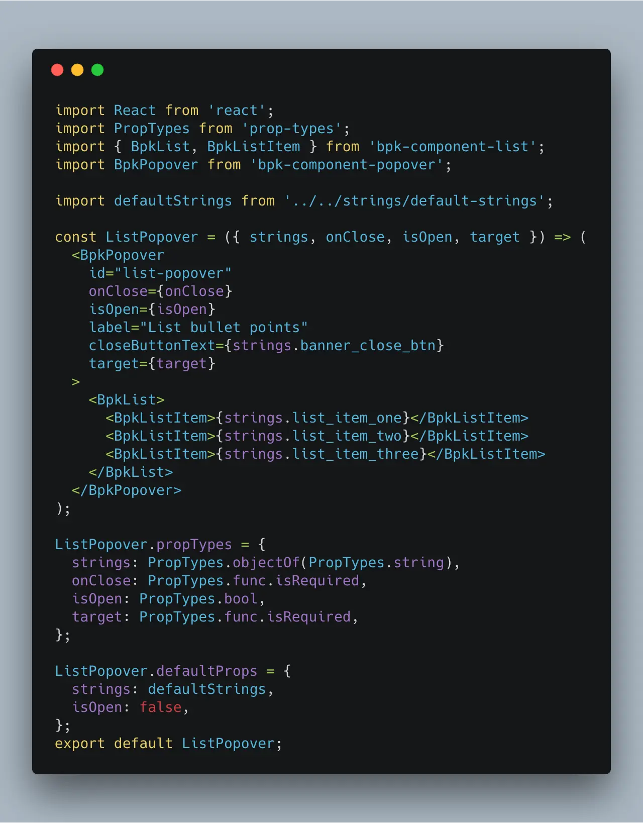 class Banner extends Component<Props, State> {constructor(props: Props) { super(props); this.state = { popoverIsOpen: false, }; ... };...};Next we hit our first difference between Function and Stateful components, defaultProps. In a Function component these were declared as we are used to, in Stateful components the external Banner.defaultProps syntax is removed, and instead the defaults are declared within the class: