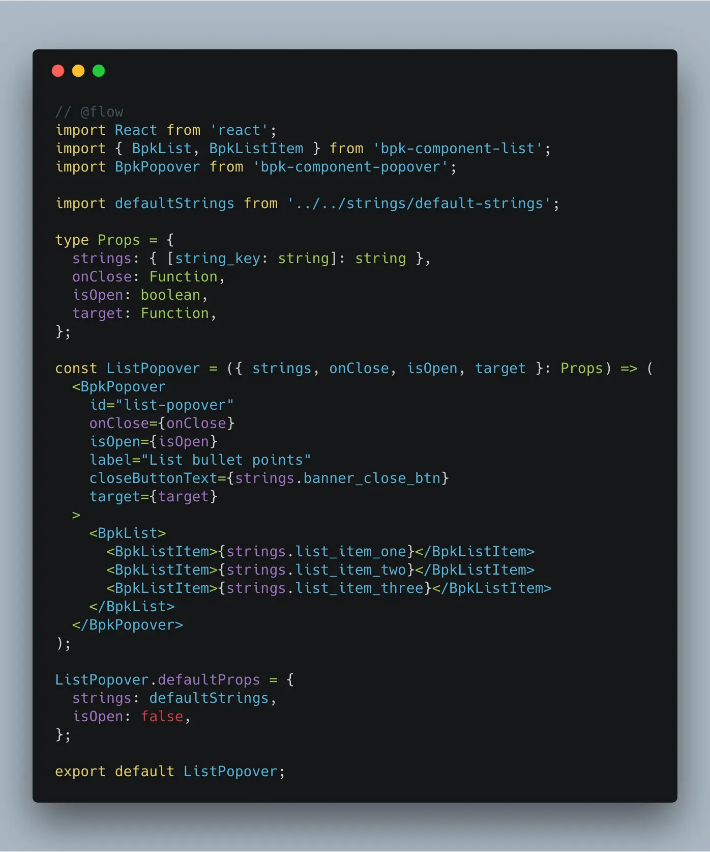 import React, { Component } from 'react';import type { Node } from 'react';...const Popover: Node = ( <ListPopover onClose={this.togglePopover} isOpen={this.state.popoverIsOpen} strings={this.props.strings} target={() => document.getElementById('ListPopoverLink')} />);Type checking imported React components