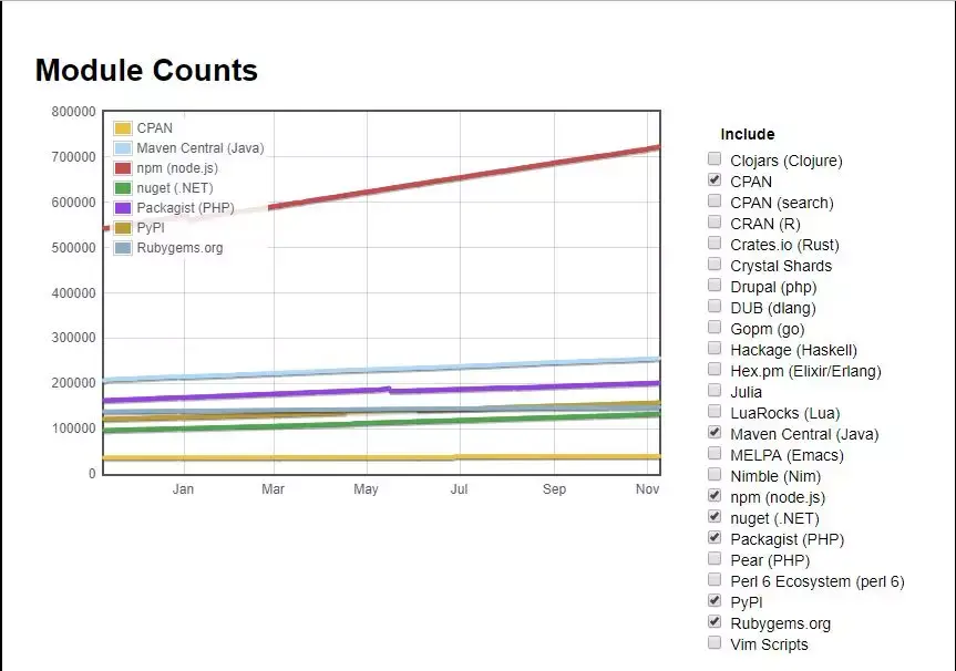 (截至发稿前,node.js的模块已经有70万+, 数据来源 www.modulecounts.com/)