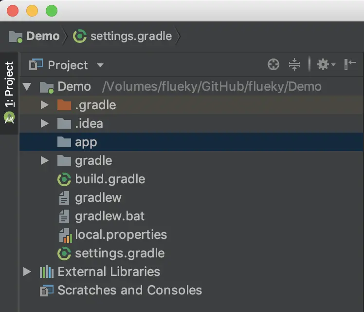 新建settings.gradle文件和app文件夹,并在settings.gradle文件中添加include ':app',再次构建工程,app文件夹图标改变。