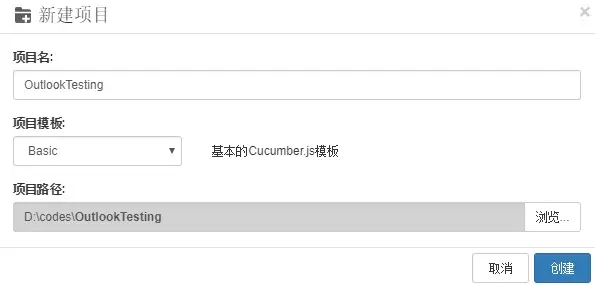 打开CukeTest,新建项目,【项目模板】选择 "Basic",【项目名】输入"OutlookTesting",【项目路径】输入自己的本地目录。点击【创建】