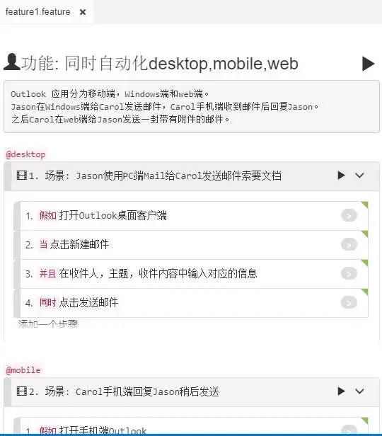 利用这样的用户场景:可以将Windows,Mobile,Web 这三端的自动化连接起来。于是我们在feature文件中可以如下编辑: