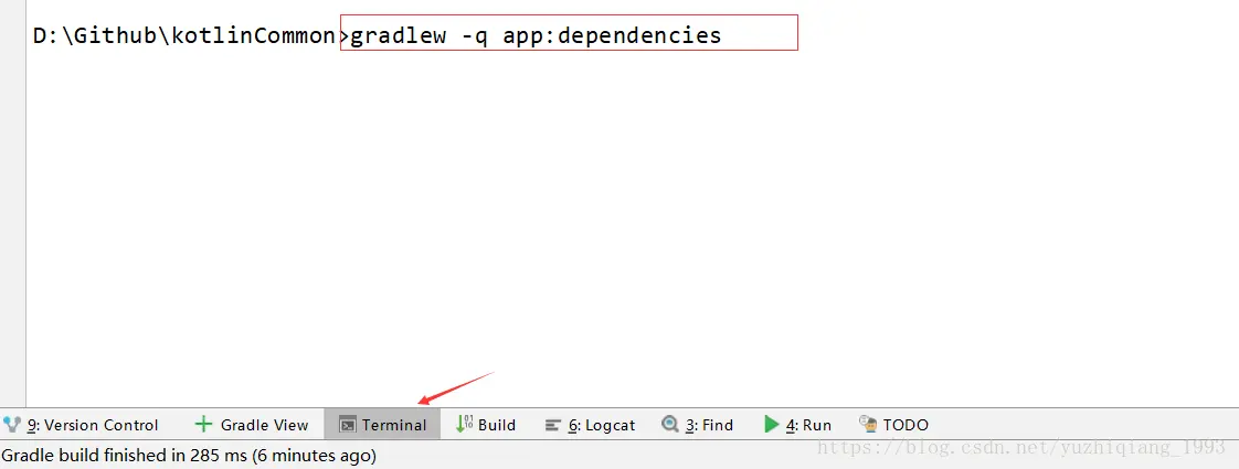 首先我们需要知道哪些库存在着冲突 点击Terminal 输入 gradlew -q app:dependencies 回车即可将app中所依赖的库展示出来