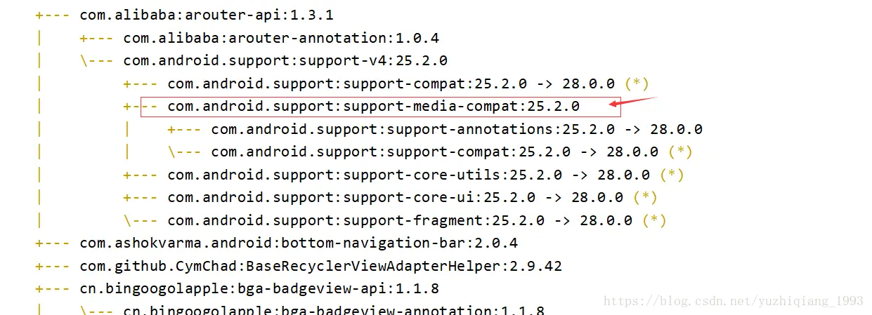 - 修改自己项目中的com.android.support的版本号,与所依赖的库版本号一致,但是当我们依赖的库中的com.android.support版本号有好几个版本就不行了。(不推荐)