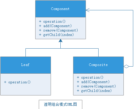 透明模式:叶节点和组合对象所拥有的操作都放抽象组件Component,这样客户端调用时,不需要判断节点类型都可以进行api调用,无需类型转换。但是对应的存在安全性的问题,因为叶节点本身并不具备组合对象add、remove、get等等有关子节点的操作api,这样的设计可能导致调用后出现与预期不符的现象,因为客户有可能会做一些无意义 的事情,例如在Leaf 中增加和删除对象等。