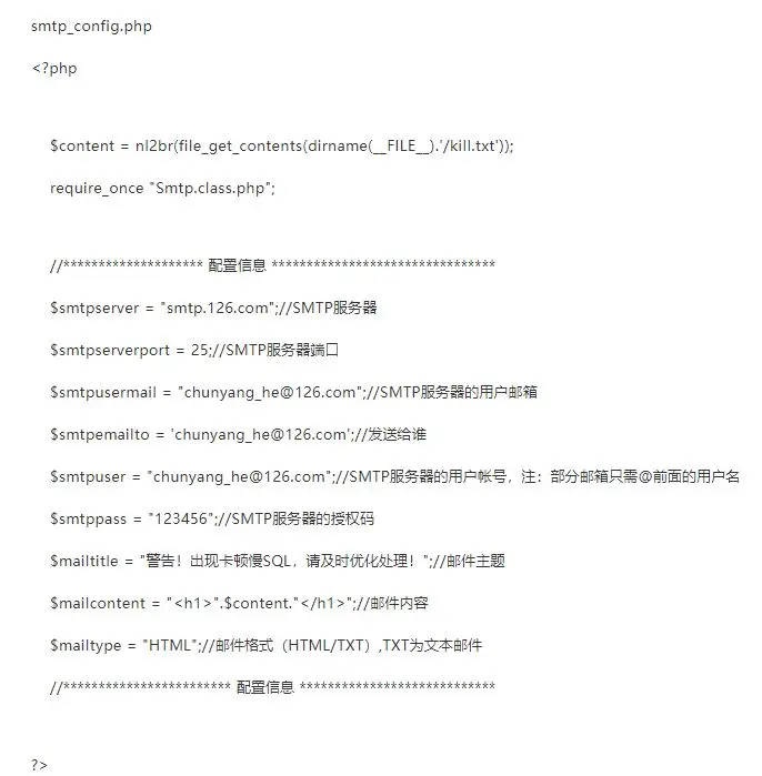 4、--mail 为开启发送邮件报警,需先设置smtp_config.php,改成你自己的邮箱账号信息