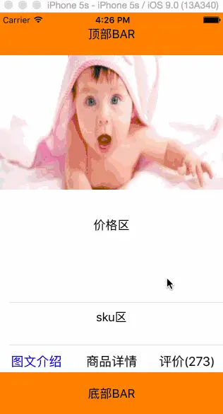 如上图所示,外层的section0为价格区,可以自定义。section1为sku区,也可以自定义。section2为TAB区域,该区域采用Runtime反射机制,动态配置完成。