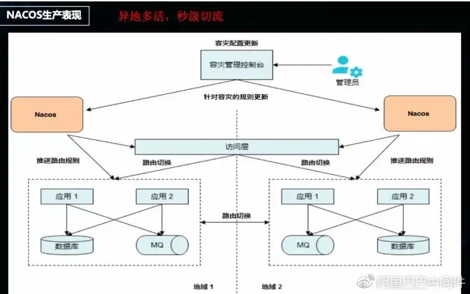 举个例子,上图左边的是机房a,右边的是机房b,其中user 1 和 user 2 是不同的用户 ID ,当尾号为0 的用户访问Region1,当尾号为 1 的用户访问Region2。但是突然我发现线上不知道谁做了变更,没查到原因,发生 Region2尾号为 1的所有用户访问全出现异常了。那是不是我要改变路由规则,让所有的用户,不管ID尾号是 0是 1 都去访问Region1 。要实现这个,就需要通过通过配置变更来实现。且实现的越快,对用户的感知影响就越小。这是Nacos在异地多活的动态路由的典型应用场景。
