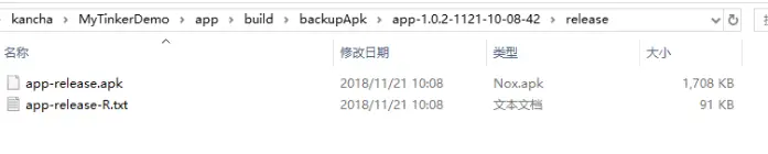 运行 assembleRelease task 构建基准包(请在发布前确保更新tinkerpatchSupport中的appVersion),tinkerPatch会基于你填入的autoBackupApkPath自动备份基础包信息到相应的文件夹,包含:apk文件、R.txt文件和mapping.txt文件 (注:mapping.txt是proguard的产物,如果你没有开启proguard则不会有这个文件)