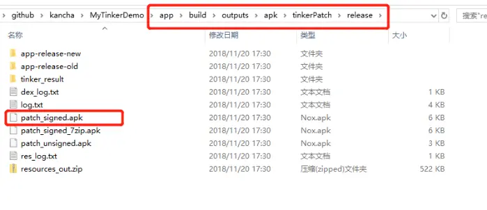 运行 tinkerPatchRelease task 构建补丁包,补丁包将位于 build/outputs/tinkerPatch下,默认的情况下,补丁包为:patch_signed.apk