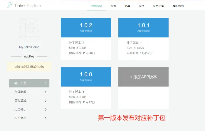 step 5:在 TinkerPatch 平台中添加 app,并获取 appkey,填入到 tinkerpatch.gradle 中对于的 appkey 参数中