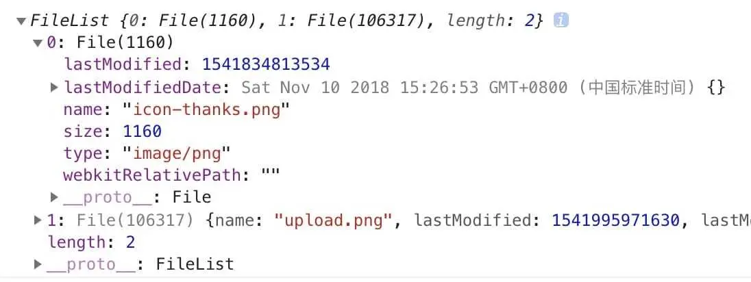 通过监听 input 的 change 事件,获取 FileList类数组对象(event.target.files)。FileList 对象的成员就是 File对象,包含的属性如图:
