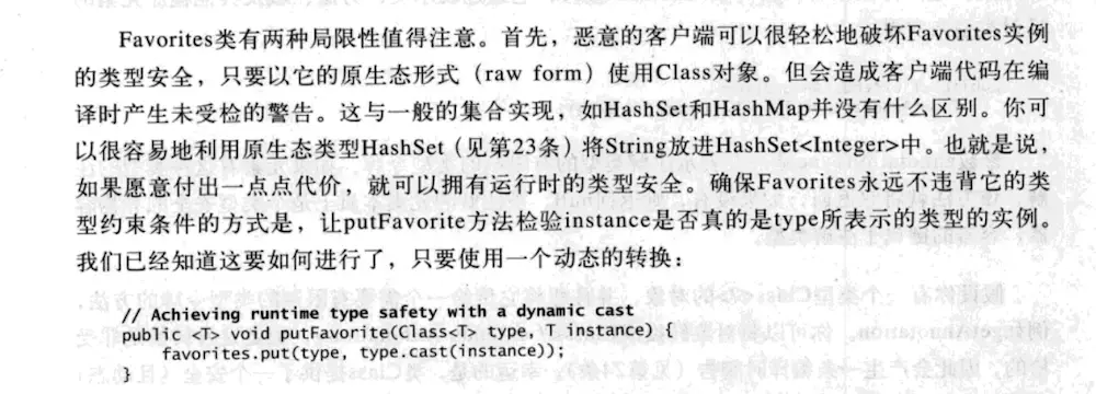 Bloch指出这种模式有两个局限性。“首先,恶意的客户端可以通过以原生态形式(raw form)使用class对象轻松地破坏类型安全。”为了确保在运行时类型安全可以在Context#put中使用动态转换(dynamic cast)。
