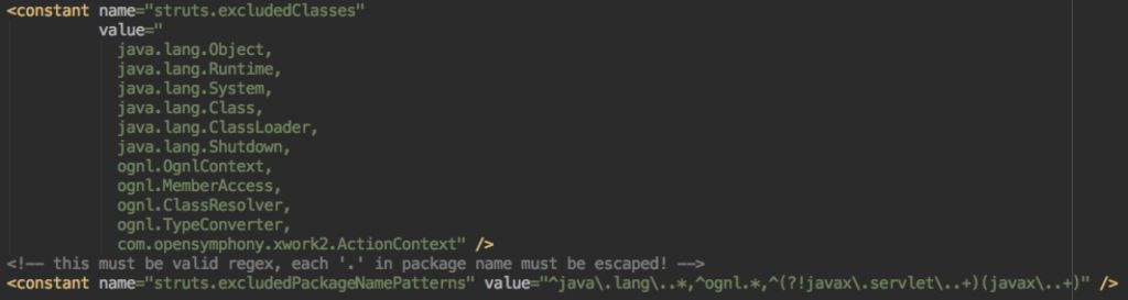 在struts2 2.3.24版本后官方增加了一些黑名单类列表以及一些包名,在struts-default.xml。