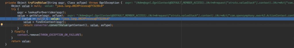 可以看到这个分支判断做了一个取反的操作,没有抛出这个错误,所以ognl表达式顺利执行。Btw,在进一步跟进的时候,发现程序在判断语句是否是evalchain的时候,一直返回null,而在修复后的版本,则准确的判断出了evalchain,这个条件语句是进行了两个表达式判断,需要两个表达式均为true才会报错。