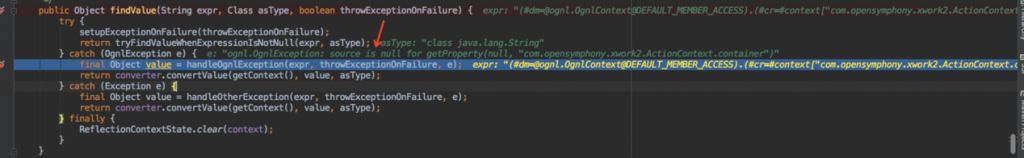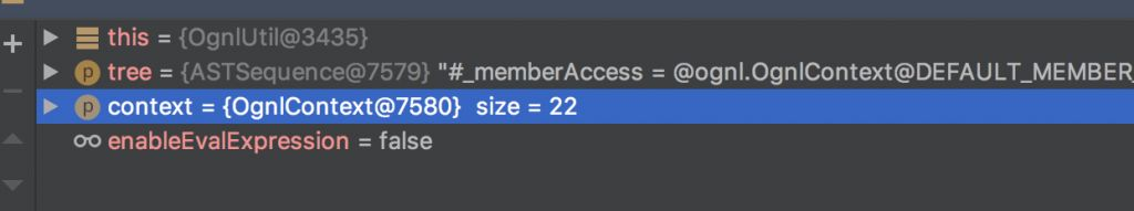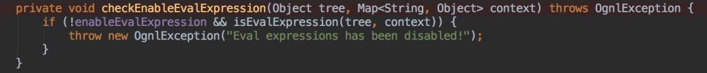 同时也与一个关键的属性有关enableEvalexpression,这个属性为true则允许执行表达式,为false则不允许执行ognl表达式,那么struts2官方针对这个漏洞进行的修复方式则是将enableEvalexpression属性设置为false,禁止执行ognl表达式,我们可以根据