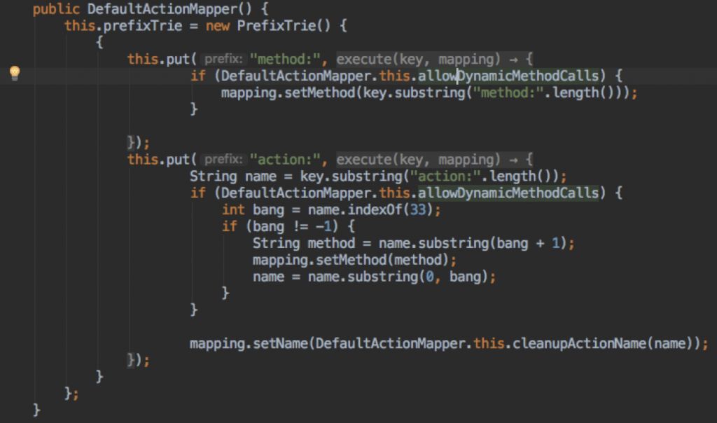 S2-016漏洞的主要原因是DefaultActionMapper类支持 “action:”,“redirect:”或“redirectAction:”三种参数,参数后的的信息未得到正确清理,导致OGNL表达式执行,官方的修复是修改了DefaultActionMapper类,删掉了 “redirect:”,“/redirectAction:”保留了method:和action:同时利用cleanupActionName方法进行了过滤。