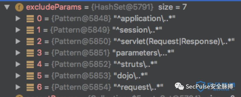 与S2-003和S2-005不同的是S2-009是参数值注入,绕过了ParameterInterceptor的限制,安全沙箱没有变化,因为之前官方在针对参数过滤器的修复的时候,只是考虑到了参数名,没有考虑到参数值的安全性,那么这次官方的修复主要有两点,其中之一是在值栈中setParameter方法将不允许参数名称中包含更多的eval表达式,然后又再次重写了正则表达式,那么在struts2 2.3.1.2中 ParameterInterceptor拦截器的正则表达式变得更为严格,同样的,也增加了 “排除参数“这样一个HashMap。