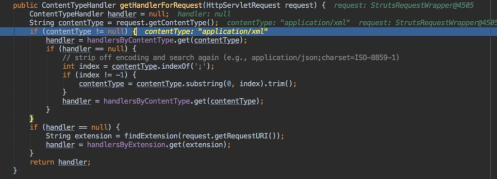 它会先获取content-type,这也是我们的poc中要修改content-type为application/xml才可以执行代码的原因,因为只有设置为application/xml,你的数据流才会到xstreamhandler处执行。