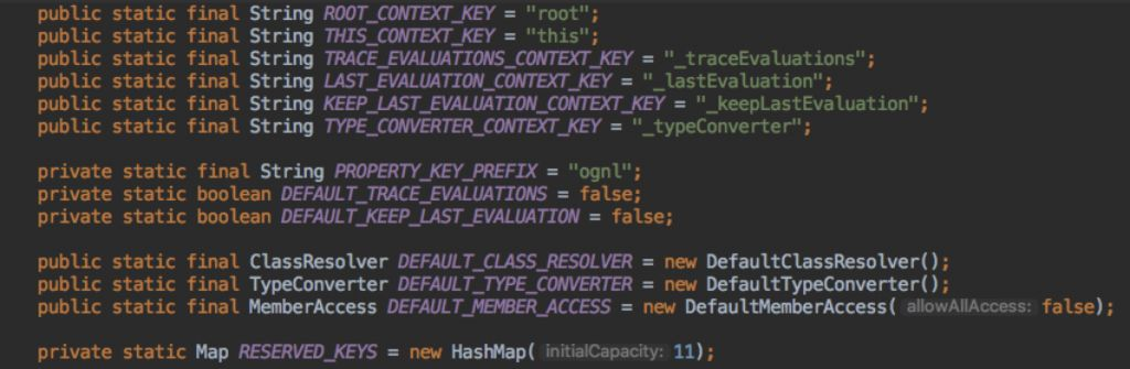答案非常简单,我们可以看到在ognlcontext类 DEFAULT_MEMBER_ACCESS其实是DefaultMemberAccess的一个实例,随后我们可以注意到一个比较关键的点。