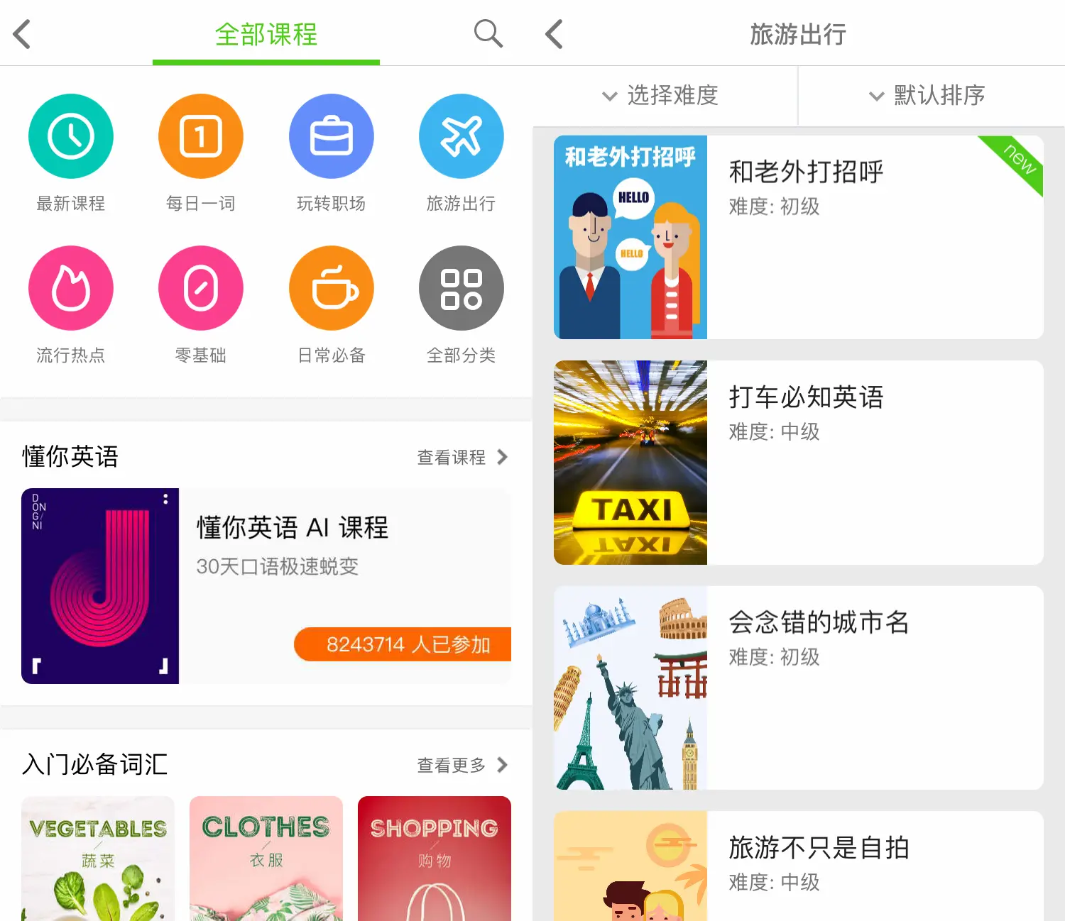 口语练习毕竟是一门功课,用户很可能中途放弃退出。为了激励用户每日打卡,「流利说」增设了游戏闯关解锁和社交元素,难度由低到高持续进阶。除此之外,还覆盖了玩转职场、旅游出行、日常必备等多个主题对话场景,提升用户口语练习的兴趣。