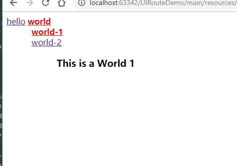 先看index的JS,world.world1 ,这个.world1就是子路由,同时在world的html里面,ui-sref里面也是有带.的,但是world2是没有的,所以world2不是子路由,所以当点击world2的时候,他就会替换掉整个ui -view,而不是ui-view里面的ui-view(子路由)。