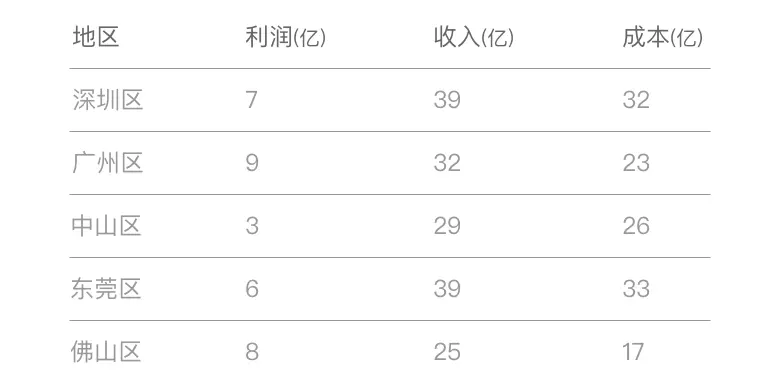 打怪升级,再加点难度。在双向图上再增加一个维度,如下表,比较 5 个地区的利润及相应的收入和成本。请先思考一下,再下滑看推荐图表。
