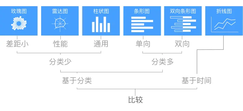 基于分类 / 时间的数据对比,通常需用到比较型图表。用户通过图表轻松识别最大/最小值,查看当前和过去的数据变动情况。