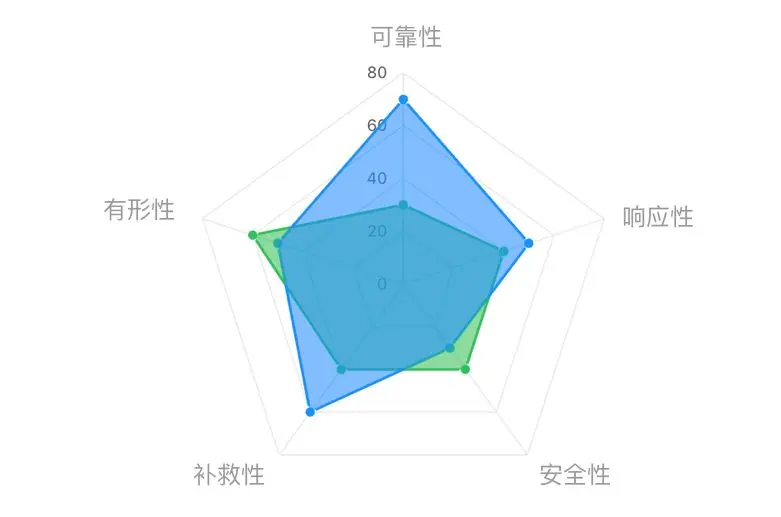 对于一些多维的性能数据,如综合评价,常用雷达图表示。指标得分接近圆心,说明处于较差状态,应分析改进;指标得分接近外边线,说明处于理想状态。