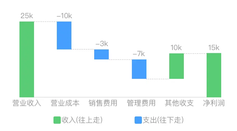 若想表达两个数据点间数量的演变过程,可使用瀑布图。开始的一个值,在经过不断的加减后,得到一个值。瀑布图将这个过程图示化,常用来展现财务分析中的收支情况。