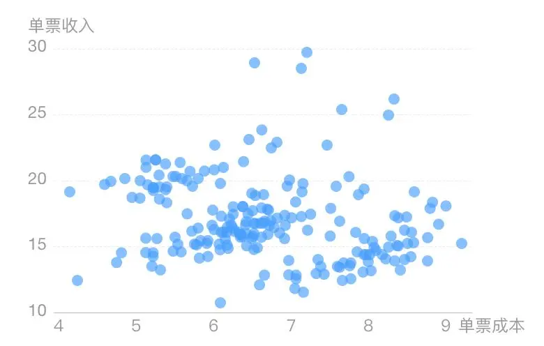 通过此图,可以看出哪些大区单票利润较低,急需提升,比如广泛聚集于右下角的第四大区,单票收入低于平均线,单票成本却高于平均线。