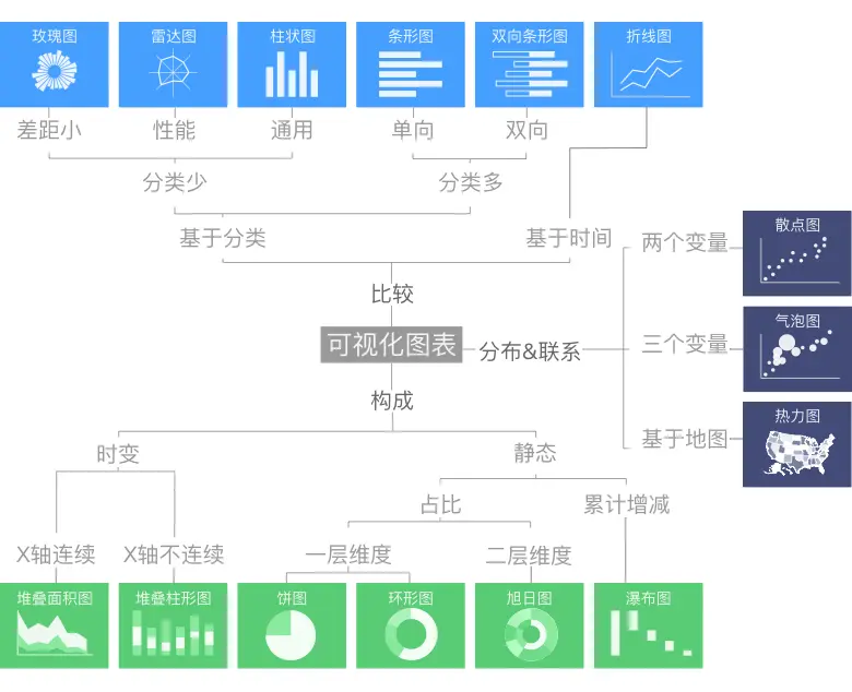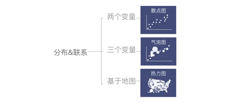 无论数据总量和复杂程度如何,数据间的关系大多可分为三类:比较 / 构成 / 分布&联系。