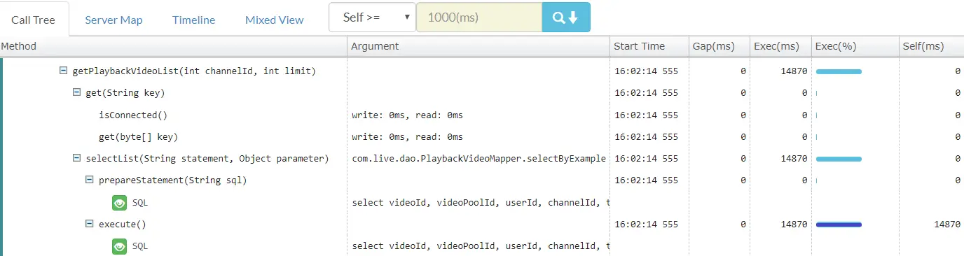 可见这个sql查询方法耗时14秒多,为什么呢?APM里面已经显示了sql语句,在mysql中执行查询发现执行时间很快,那么问题出在哪里呢?只能继续深挖!
