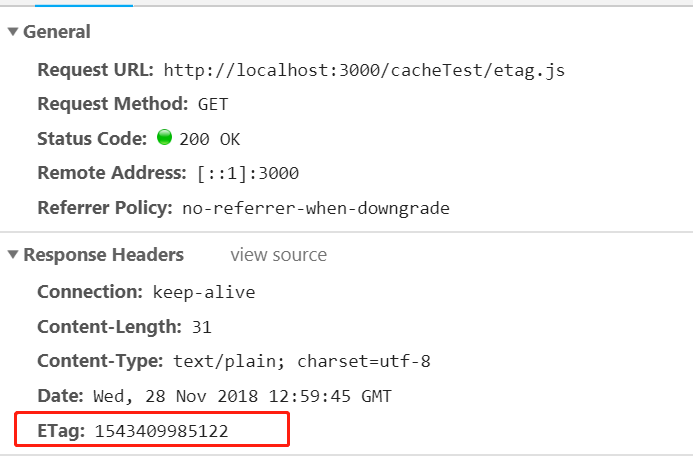 Etag的一次请求时,服务器返回的响应头里面包含缓存标识Etag