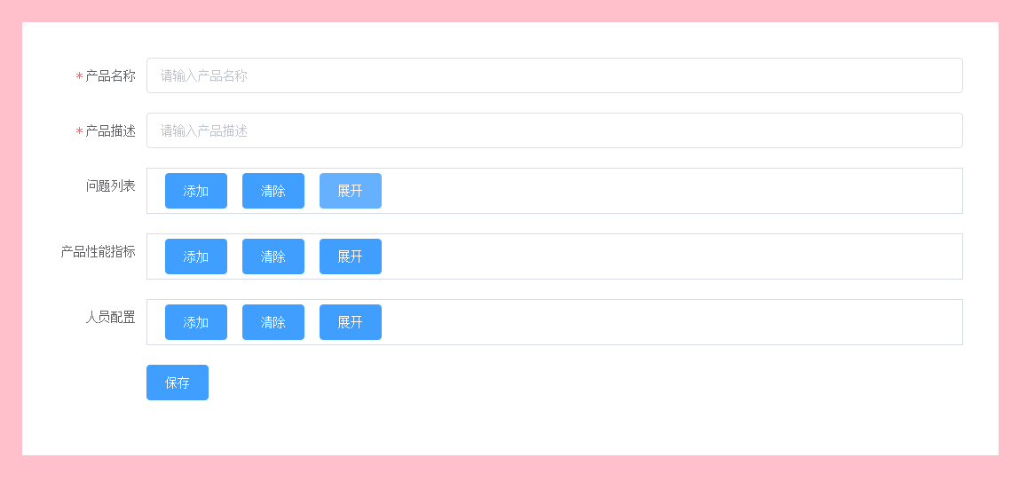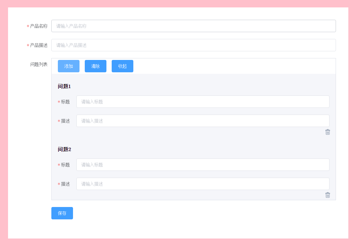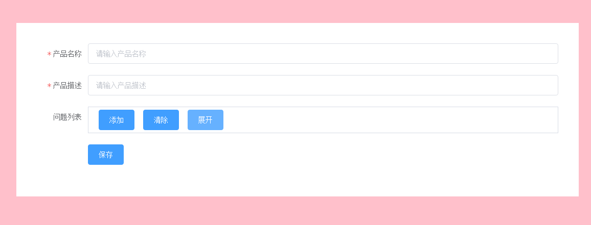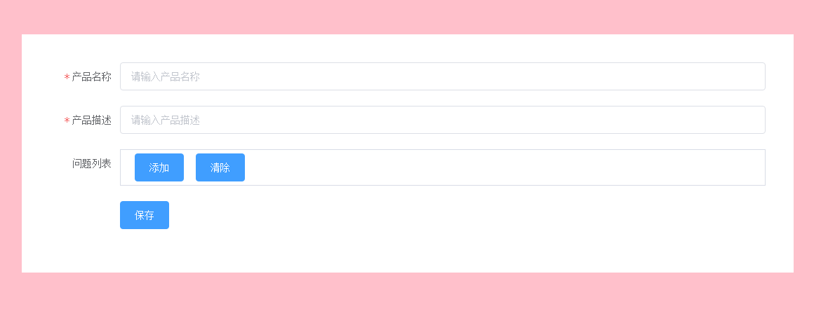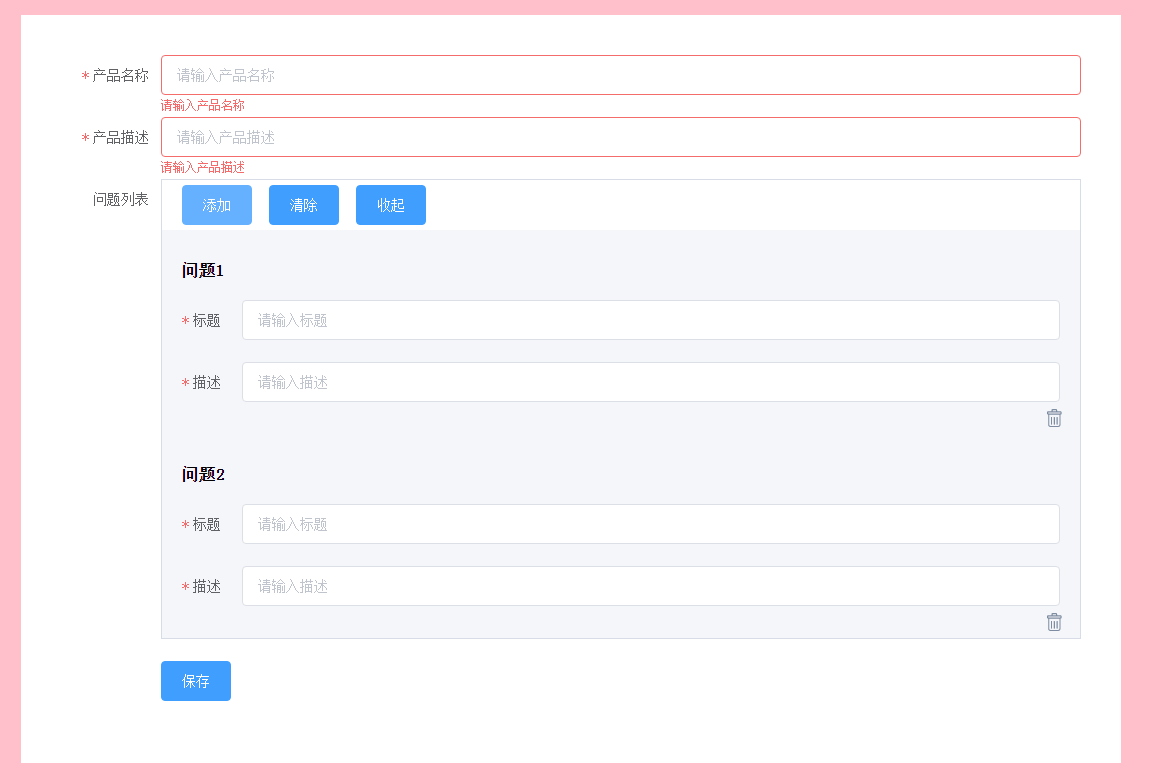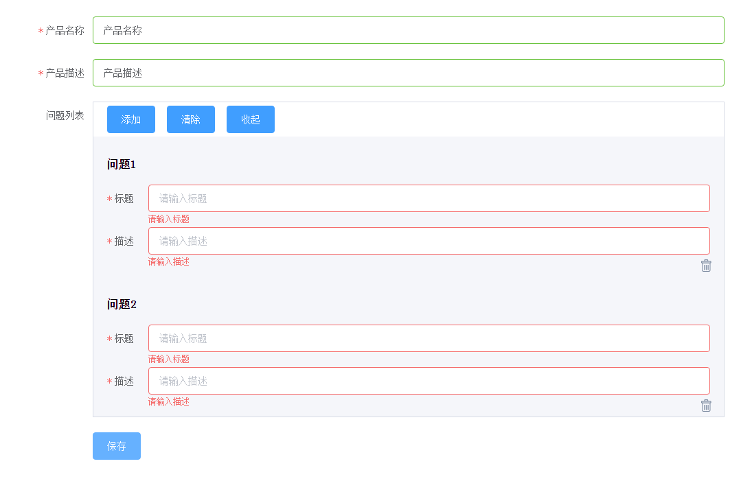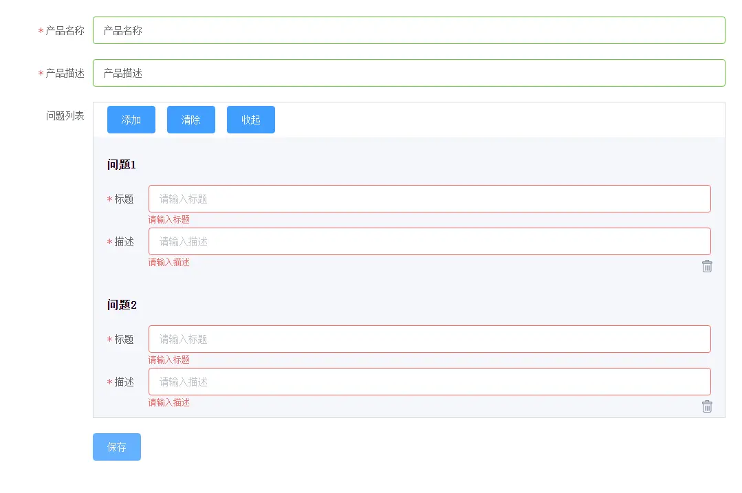- 功能点介绍:这是一个描述产品信息的页面,整体是一个form表单,需要验证产品名称和描述。针对这个产品需要问题列表,用于收集用户对这个产品的反馈信息。问题列表可以不填,但是一旦添加了问题,问题的标题和描述都是必填的。